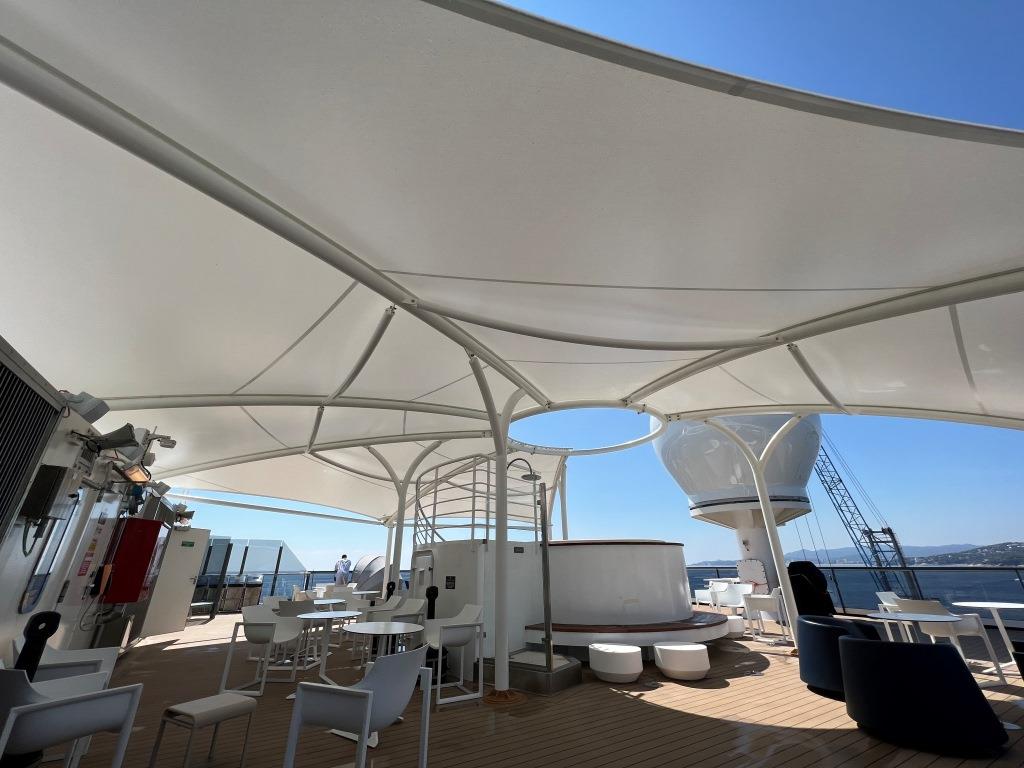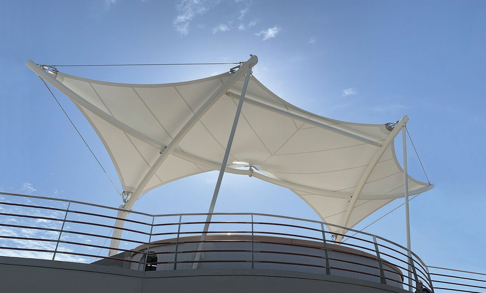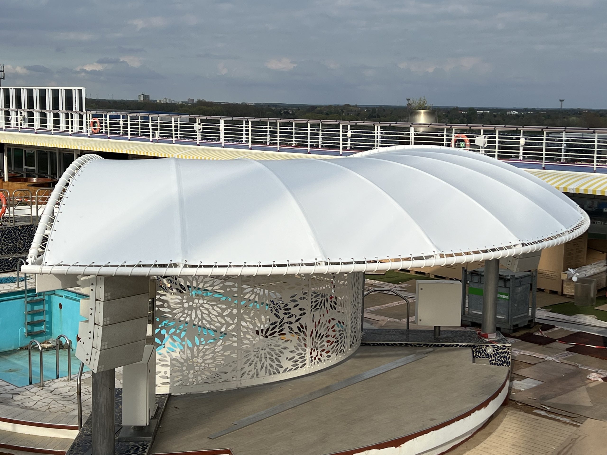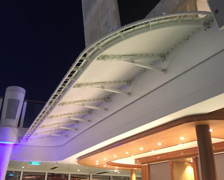 OSCA Ocean Shade Canopies & Awnings can offer a solution to all fabric requirements on board Cruise Ships. This will range from complex tensile canopies covering Jacuzzi’s, bars and alfresco dining to superior deck head linings throughout the ship. A turnkey service is offered from design and engineering to installation with our dedicated certified team.